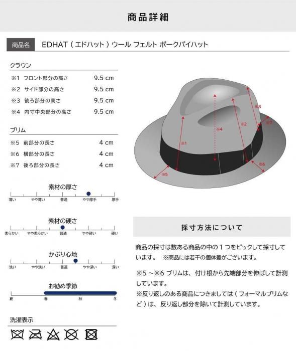 商品について 老舗国内ブランドEDHAT(エドハット)のウールフェルト製ポークパイハット。